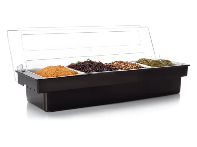 Corps en polypropylène noir, couvercle en polycarbonate transparent pour visualiser immédiatement le contenu.