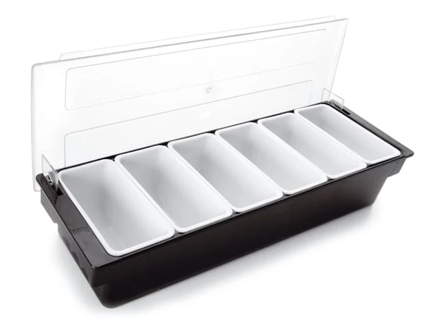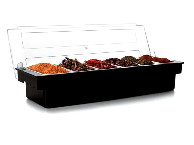 Corps en polypropylène noir, couvercle en polycarbonate transparent pour visualiser immédiatement le contenu.