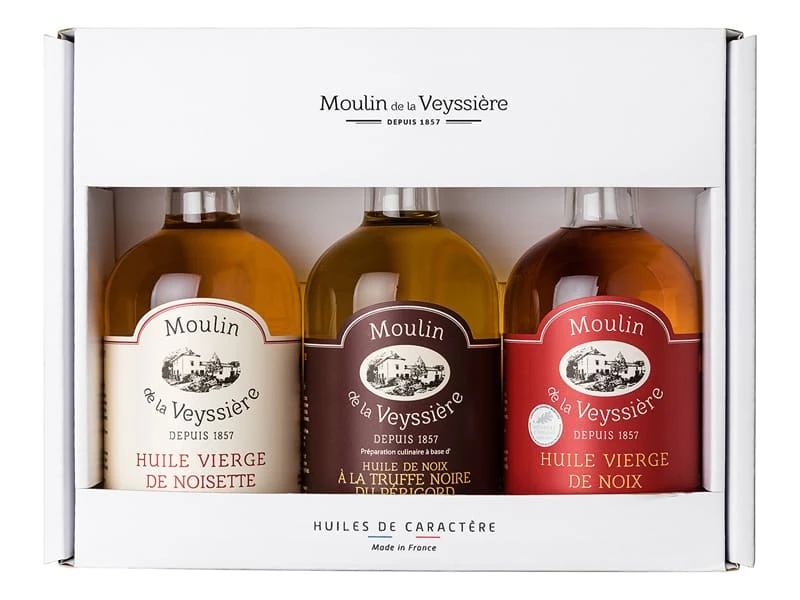 Le coffret de trois huiles de noisettes, noix, et noix à la truffe noire du Moulin de la Veyssière est bien plus qu’une simple collection d’huiles. Il incarne l’excellence gastronomique et l’authenticité profonde du terroir français.