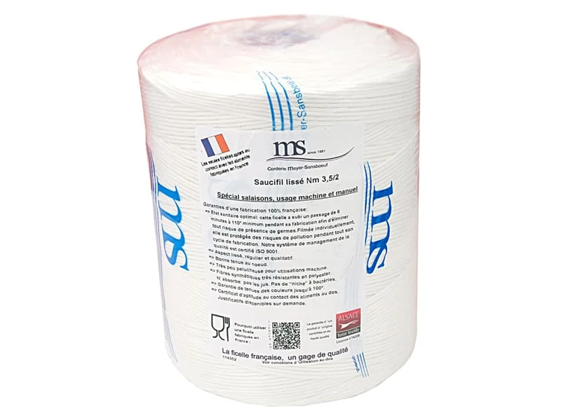 Ficelle en polyester blanc “Saucifil”, emballage étanche, résistant en milieu humide.