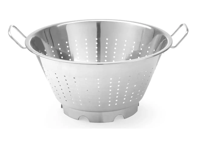 Passoire conique sur pied, avec 2 poignées soudées, en acier inoxydable.