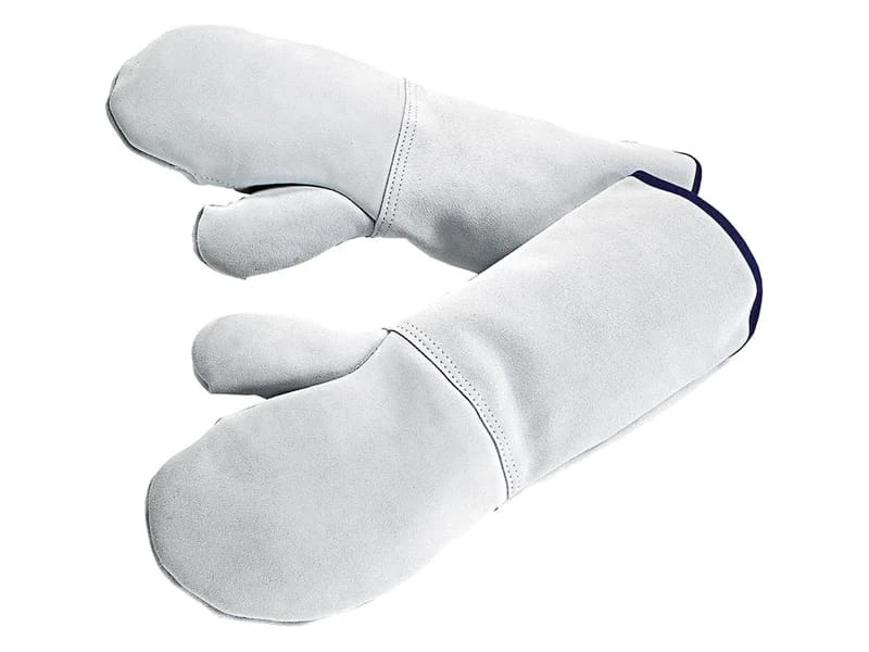 Paire de moufles de protection thermique en cuir destinée aux hautes températures.