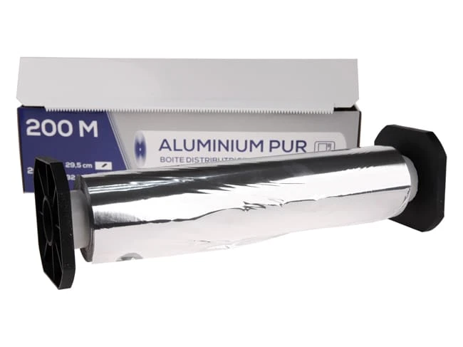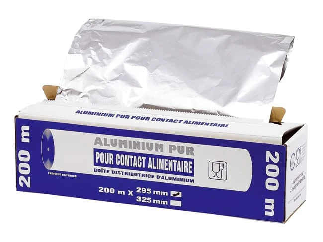 Rouleau de papier aluminium en boîte distributrice.