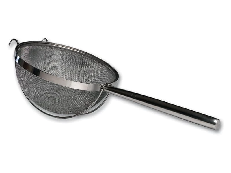 Manche en acier inoxydable muni d’un crochet de suspension. Avec tamis interchangeable, qualité extra-forte. Toile double maille (fine intérieure, large extérieure) en acier inoxydable.